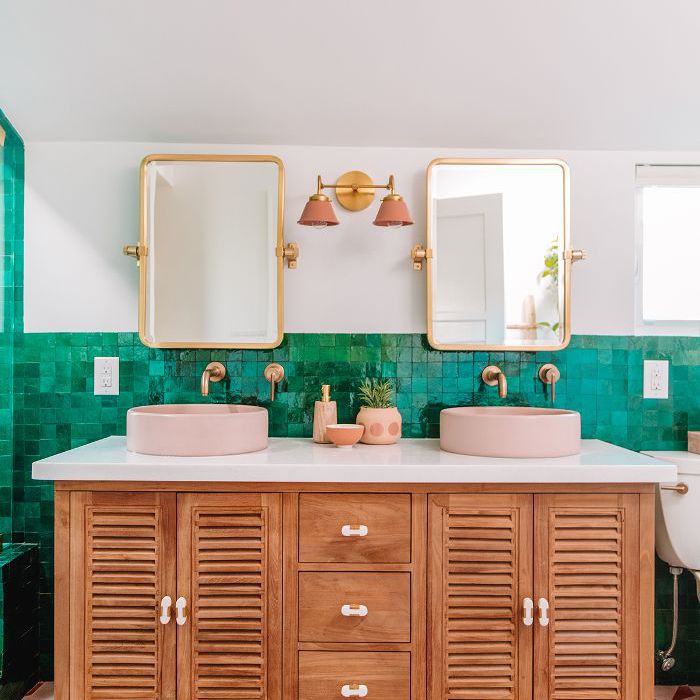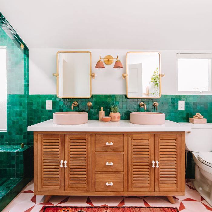 Mindell在步入式淋浴间和梳妆台后挡板上使用了手工制作的赤陶zellige瓷砖,来自Morrocco的Cle瓷砖。这是一个引人注目的声明,但我们喜欢颜色的变化。