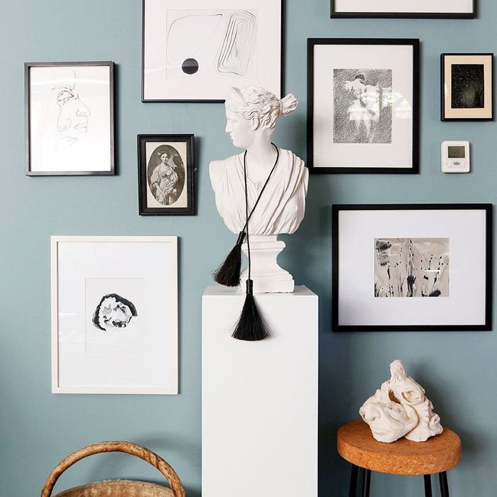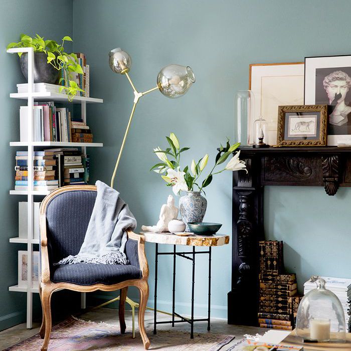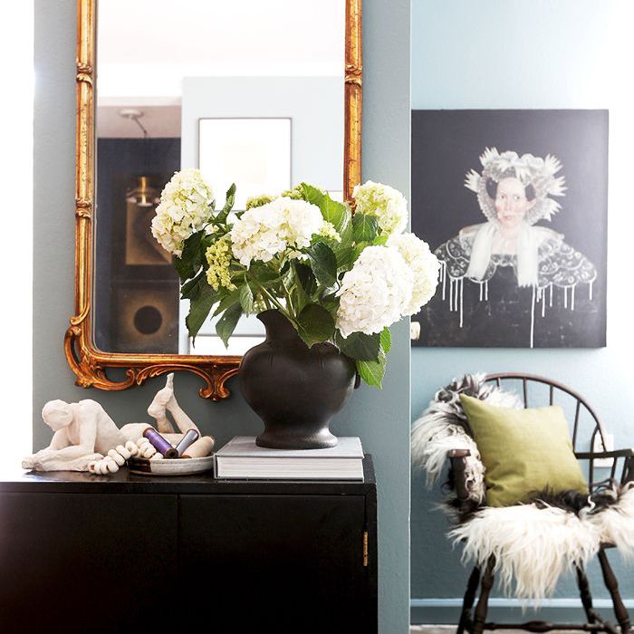 “我有一间黑暗的卧室,”Sotelo说。“有一扇朝北的小窗户,如果可以的话,只能让一缕自然光透进来。多年来,我试着让空间变得更明亮,但今年年初,我想,为什么不拥抱黑暗?所以我把我的墙壁涂成一种郁郁不乐的蓝绿色,然后我用一些黑色的强调部分分层。虽然我喜欢高对比度,这种单色的外观提升了房间,我喜欢它。它能让我在漫长的一天之后放松,在我准备睡觉的时候让我的大脑平静下来。”