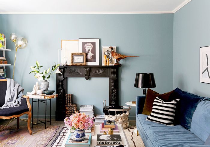 “在客厅里,几乎所有的东西都是古董或被发现的,除了像沙发这样的几件大件,”Sotelo说,她回忆起她如何最终实现了拥有一个蓝色天鹅绒沙发的梦想。“我从《室内设计》(Interior Define)杂志上挑选了一款新沙发,然后为了打造单色外观,我选择了一种非常相似的墙壁颜色。”She explains how she wanted to do a play on tonal colors, so she painted the walls a lighter, moodier blue.