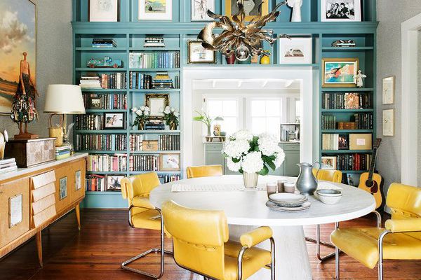Magel可能会被明亮的室内设计所吸引,但餐厅是她选择更具戏剧性风格的空间之一。她解释说:“对我来说,当你走进餐厅时,它本身就是入口右侧的一颗小宝石,所以我决定去黑餐厅。”“我在墙上画了菲利普·杰弗里斯的黑布,几乎是黑色的,然后我用深海军蓝的颜料从厨房的砖块间穿过,为房间的小壁龛做装饰。”In the carved nooks, the designer set up a fully stocked bar for easy entertaining.
