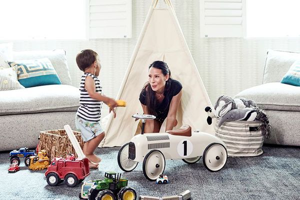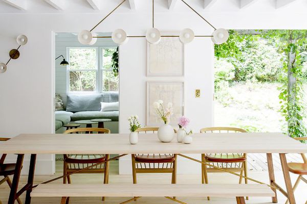 与对比和纹理播放,Magel能够创造一个温馨和分层使用短短中性色调的感觉。“我知道厨房将是全白色的,所以早餐桌上需要是一个巨大的黑核桃的一块,”她说。"I lightened that up with chairs from Homenature that have a woven canvas seat and put sisal on the floor. I also added the Apparatus light with the big round bulbs which made the space so interesting. I wanted to get a light that didn’t compete with the kitchen fixtures."