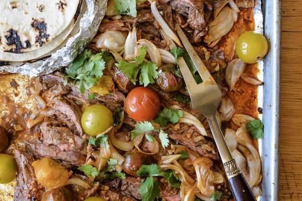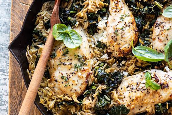 配方:使用简单的锅,则此烤盘哈里萨辣酱鸡与鹰嘴豆和红薯是一顿简单的工作日晚餐的定义。只需要在上面放上咸羊乳酪、咸橄榄和新鲜的薄荷,然后就可以享用晚餐了。