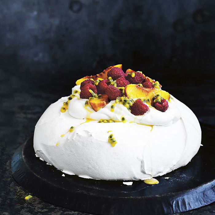 3.将巴甫洛娃放在蛋糕架上或盘子上,在上面撒上鲜奶油、覆盆子、西番莲果和桃子。