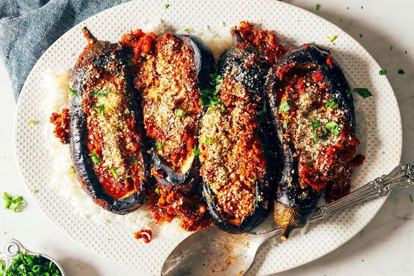 配方:将茄子对半切开,加入橄榄油、盐和百里香调味,然后放入烤箱烘焙45分钟。用新鲜的欧芹、柠檬汁和山羊奶酪调味过的小扁豆填满它们,等它们刚从烤箱里热出来就可以变软了这简单的一餐。