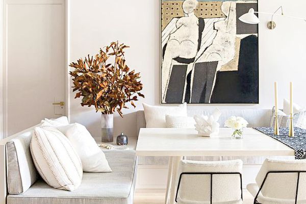 为什么这是伟大的:灰色的面板包围的空间,从语句灰色的墙向左侧的地板到天花板的布料和浅灰色的地毯,打造完美的中性调色板介绍声明片像一个大胆的橙色奥斯曼帝国和ASH纽约的弧形凳。对象和形状的组成,从控制台到角落里的橄榄树上的尖刺足碗,罢工完美时尚与永恒之间的平衡。