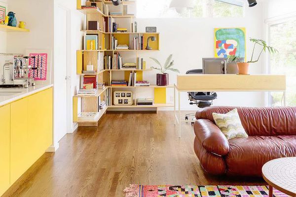 在曼迪·摩尔的家庭活动室,通过设计萨拉·塞缪尔·谢尔曼,长浮水磨石长凳运行壁的整个长度,兼作炉床和额外的座位。的光的颜色和混合材料使这个世纪中叶现代空间到本同时尊重周期的样式和比例。
