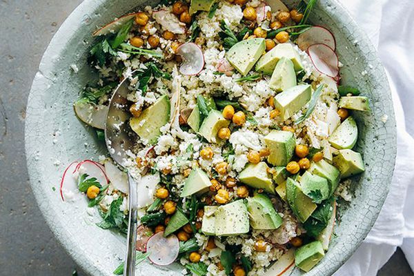 完成与花椰菜,石榴籽,坚果和意味,这是完美的冬季食谱。在将此烤花菜的沙拉食谱被困在厨房如果你想要一个填充,温暖的沙拉不会离开你HANGRY,不要忘记将茄子豆沙和核桃dukkah。