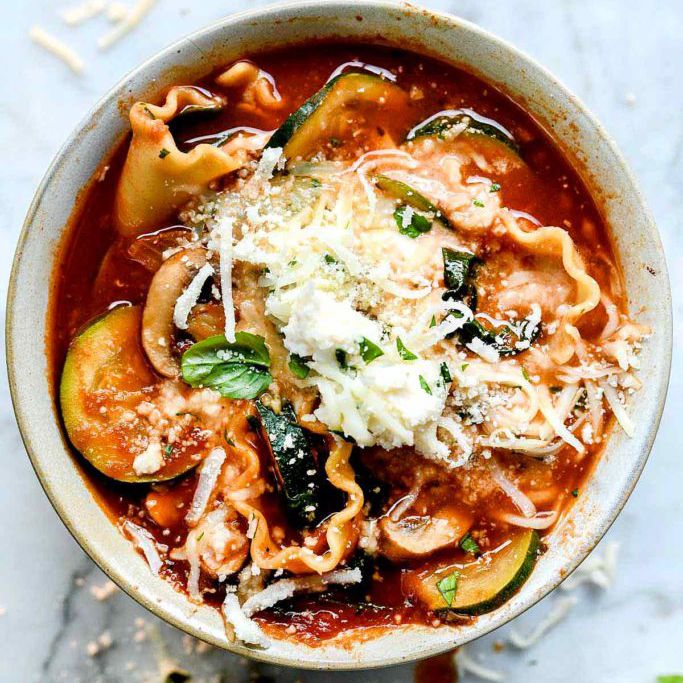 英雄的成分:这道丰盛的千层面汤的配方中充满了健康的蔬菜,一旦一起烘烤,就会成为一道美味的混合菜,但真正能让你征服它的是第一口意大利乳清干酪。