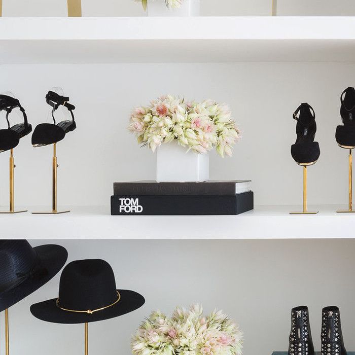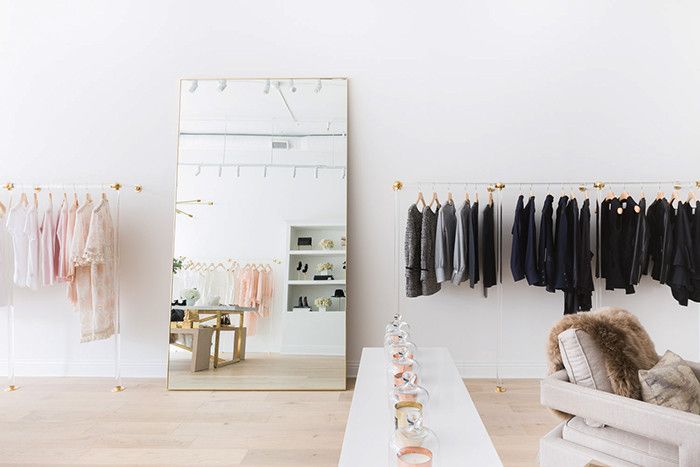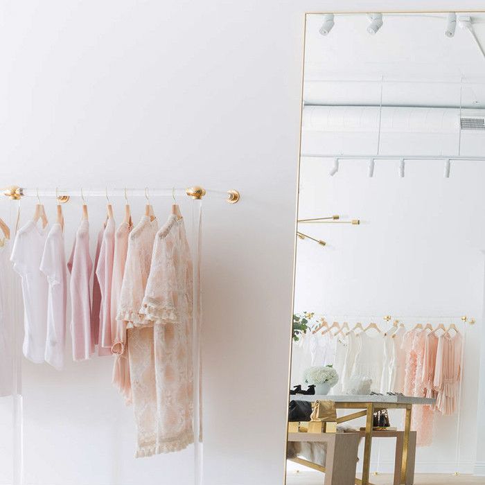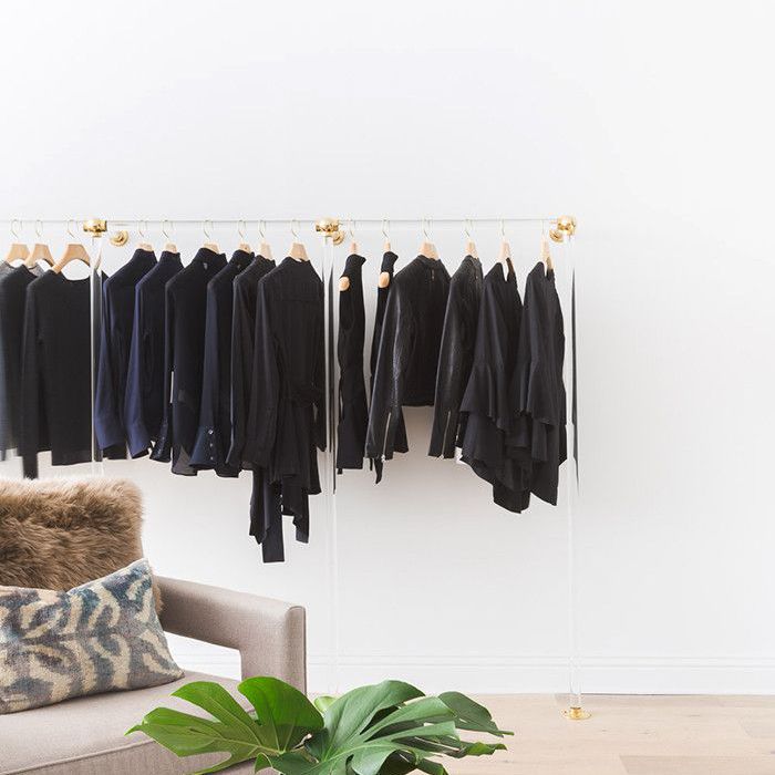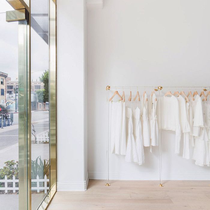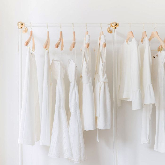 服装看起来最好以白墙,所以决定粉刷墙壁和天花板明亮的白色是非常简单的。“我想黄铜元素活了过来为好,这就是为什么机架本身是黄铜和璐彩特,”她说。“璐彩特允许衣服活灵活现的衣架,其清晰,消失在墙上的另一要素。”