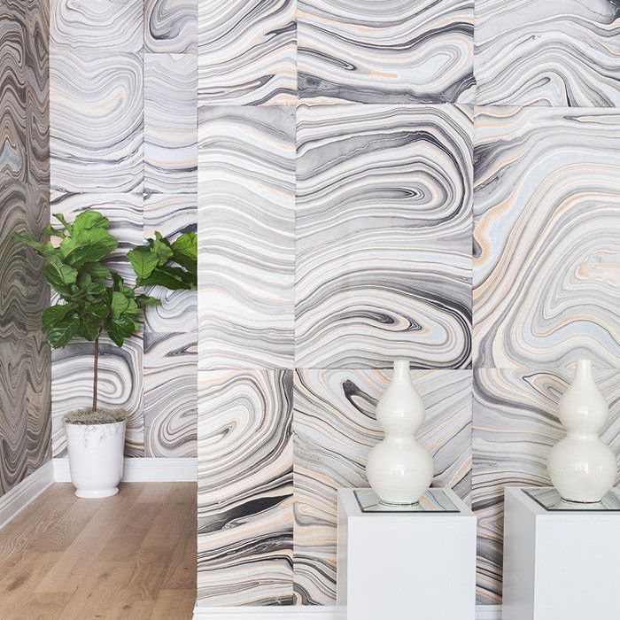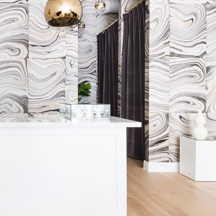 该大理石壁纸在前面延伸至后壁,向其中加入以创建敷料和仓库。“走廊创建的私密感觉,使空间显得大于它,”她说。