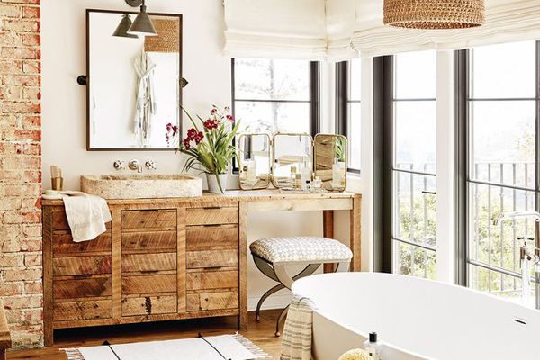 箴样式提示:在双凹槽上方并排挂两个镜子是创造对称和凝聚力的好方法,而不是在中间放一个大的矩形镜子。