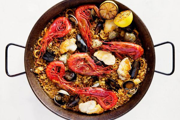 “在西班牙,米饭是更多的大米比加载项。但在美国,更是多,所以这个饭充满与鸡,虾,蛤,蚌类,鱿鱼和香肠的边缘。这个想法在这里是添加任何你想要的。我坚信,西班牙海鲜饭的美妙之处在于它是可以改变的,以根据自己的喜好,根据不同的季节,你在哪里,和谁吃它。这个版本是我的美国朋友。供应2作为主菜或4至共享“。