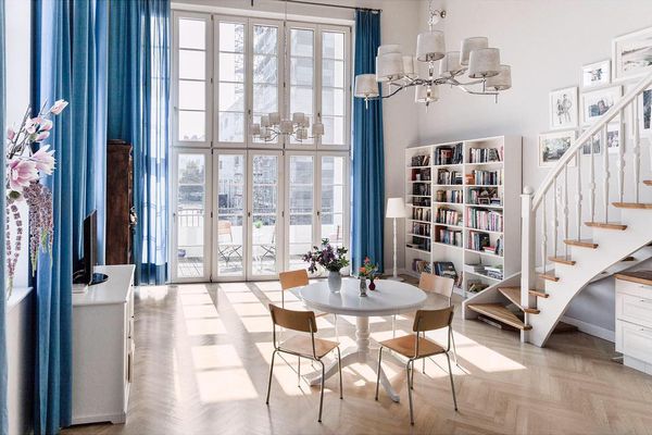为什么我们喜欢它:虽然这种生活空间有高高的天花板,真正打通的房间,你可以画你的墙壁和天花板上一个温暖明亮的白色重新建立一个宏伟的感觉。如果你得到的自然光量好甚至更好的阳光会弹开白色的墙壁,让您家的感觉大,干净。