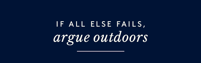 没有人想建设一个家的时候,但有时争吵是不可避免的陷入争论。“如果一种说法是不可避免的,出去走走,并讨论不管它是在公寓外,” Hindin - 米勒说。“这是在露天通话以外容易得多,而你走相邻比它是当你在客厅里坐眼球眼球。”作为在公共空间也能带来自我意识和水平的限制,它鼓励文明建设性的对话,而不是尖叫的比赛。