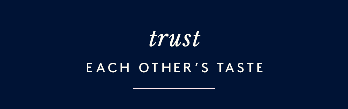 一个装饰的资本规则:不要在没有咨询其他人购买任何东西。“如果你们中的一个发现布鲁克林郊区的一个了不起的一件家具,其他的应该陪你一起去看看,” Hindin - 米勒说。