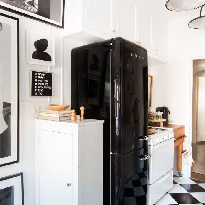 在与餐厅的黑与白的主题,托尔伯特选择安装一个全黑的Smeg放冰箱旁边现有的炉灶。地板是一个天才DIY技巧:他们是他安装在现有的地板上居然可移动的剥离和粘瓷砖。