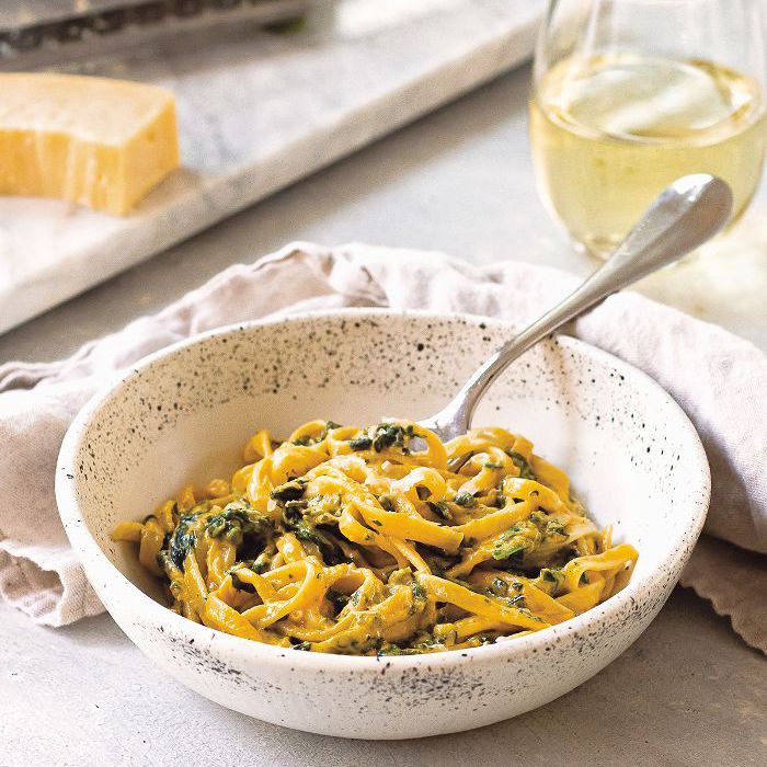 “如果你只考虑过南瓜作为甜点的原料,那么这种面食可能看起来有点奇怪。但我可以保证,它值得在你的美味食谱中占有一席之地,没有比奶油意大利面更好的尝试方法了。酱汁从最基本的阿尔弗雷多开始,加入南瓜和菠菜。然后,把酱汁和热意大利面搅拌在一起,晚餐就做好了。”