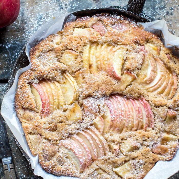 将面糊倒入备好的锅中。把苹果一片片地推到一起,这样每一片之间都有一点面糊。烤大约50分钟,直到中间插入的牙签干净。允许冷却。上桌时,撒上糖果粉。