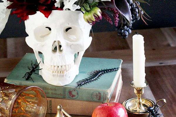 召唤玛丽·拉文在万圣节搭配华丽的丝绸,比如夸张的裙圈和亮色的披肩。包括一条塑料蛇。