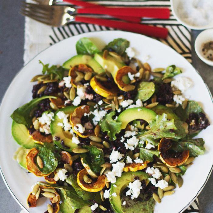 几招试试:完成与delicata壁球和鳄梨,这种有益健康盐风沙拉食谱是一种美味的借口多吃鳄梨。它比一般的自制沙拉更令人满足的,也是很多更令人兴奋的,这要归功于像辣椒粉,羊乳酪,烤配料黑米,南瓜(镁含量和额外的紧缩加分),和肉桂粉种子。