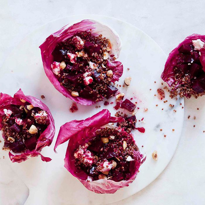 “红甜菜渍什么,他们接触到的,但在这个色拉,甜菜汁的红色污点只是让在这个配方更红的红藜麦和菊苣,所以沙拉完全致力于其红肿。我有时用菊苣leaves as the 'bowls' to serve the salad in, but if that’s too cute for your taste, I totally understand.