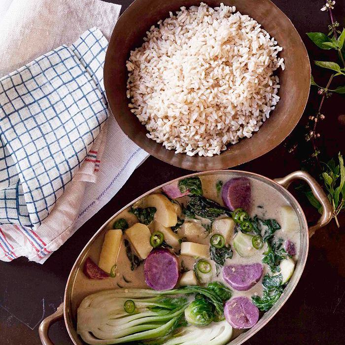 “泰国咖喱酱是发生在匆匆赶回家,因为预洗的青菜煮。所有这些神秘而美妙的泰式咖喱味,提炼成一个小实惠的罐子,你可以找到,即使是最不起眼的超市货架上的最好的事情。你需要coconut milk and fish sauce to complete the magic, so if you keep those in your pantry, you’re just one fresh vegetable away from a warm and tasty last-minute meal. This is dairy free and vegan if you use water in place of chicken stock.如果你想补充蛋白质,加1个去骨去皮鸡胸肉半,切成1/2英寸的立方体,并在食用前煮咖喱5分钟。”