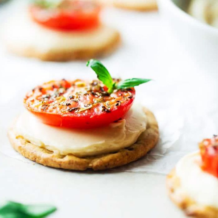 这些小披萨咬起来食品信仰健身比预先包装的冷冻替代品都非常健康,他们只需要五个成分,使它们超级容易掀起。选择全麦饼干,一些罗马西红柿,新鲜罗勒,并在上面奶油芝士酱的一小斜。