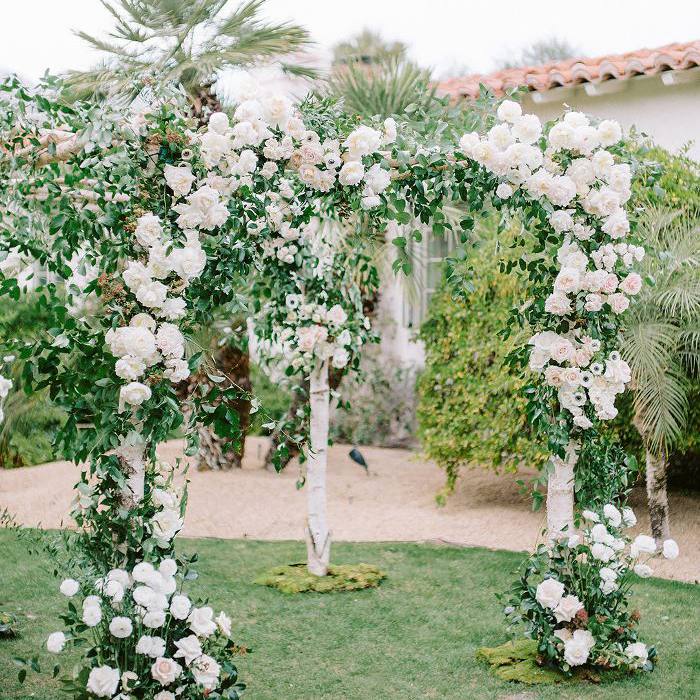 客人聚集在殖民地棕榈酒店在棕榈泉,你会发现会场里到处都是芬芳的牡丹和玫瑰。“Holly Vesecky和了不起的团队Hollyflora创建白色牡丹,玫瑰花园,海葵,撒哈拉玫瑰,茶花,茶花绿色和桃金娘果岭的超级郁郁葱葱的大背景下,”科尔说。