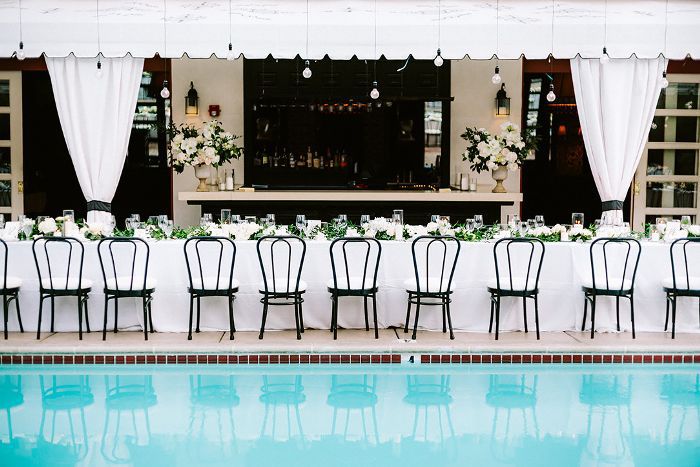 长面包表框的殖民地棕榈酒店游泳池,那里的鸡尾酒酒会和晚宴举行。鉴于户外设置,科尔说,她意识到照明。“我知道我们有一组照片疯狂的朋友,因此照明肯定是我们考虑了不少,”她说。“我们想要的东西令人难以置信的奉承和看起来很美也和贝丝想出了拉丝表上面水晶宝珠灯的想法,这是可爱的,优雅的更新,以典型的爱迪生灯泡。”