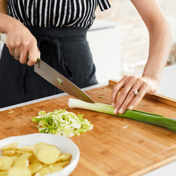 切韭菜长,保持白坯完好。“韭菜有很多污垢隐藏了在不同的层,所以记得在此步骤中彻底清洗,”她建议。然后,去皮切小片韭菜和葱交叉。