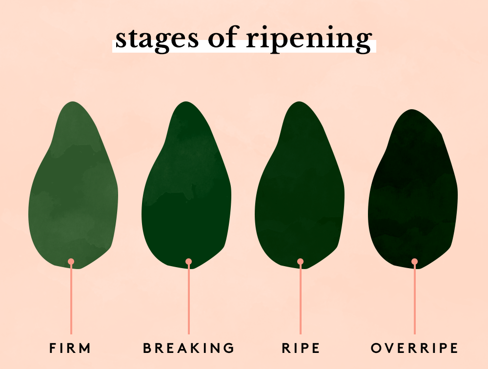 我们的教程从探索鳄梨成熟阶段的完整色谱开始。正如清楚说明的那样,果实成熟后颜色变深。轻盈、结实(如岩石般坚硬)的牛油果可能采摘得太快了。当色调开始从深绿色转向棕色时,它就开始变得过熟了。