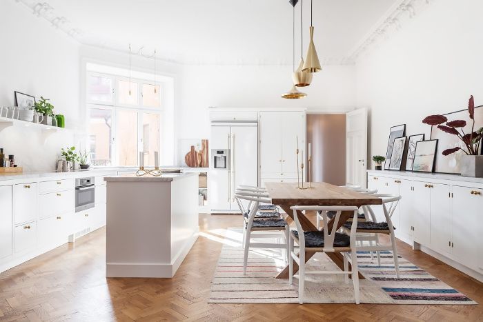 而不是更常见的岛与barstools设置,这个更小斯堪的纳维亚的厨房设有一张窄岛的空间。厨房其余双打作为一个正式的餐厅。艺术品,使空间感觉更加有层次感,少育。