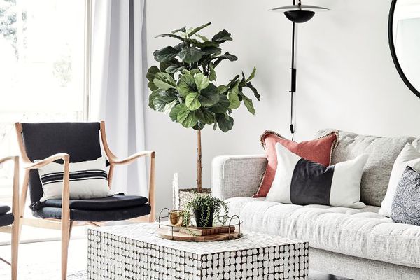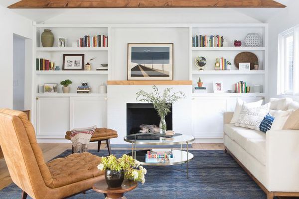 托马斯说,她有低估家具大小的可怕的习惯,“我总是太大了,这事与华丽艾略特椅子从Joybird。James, my son, is obsessed with climbing over them—they’re so generously proportioned." Originally Thomas planned on creating a classic conversation set–two chairs facing a couch across a coffee table–but it didn’t work. "The room had a weird flow and everything was scrunched up against the fireplace," she continues. "I moved one of the chairs to the side, creating more of a square shape to the layout, and it made such a big difference.流是伟大的,实际上会话。既舒适又整洁。”