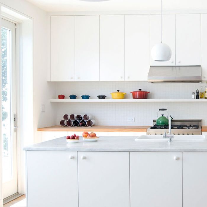 存储是必须的,如果你想保持你的厨房整洁。这种全白的空间提供了充足的橱柜空间,所以只能选择丰富多彩的炊具留在显示器。