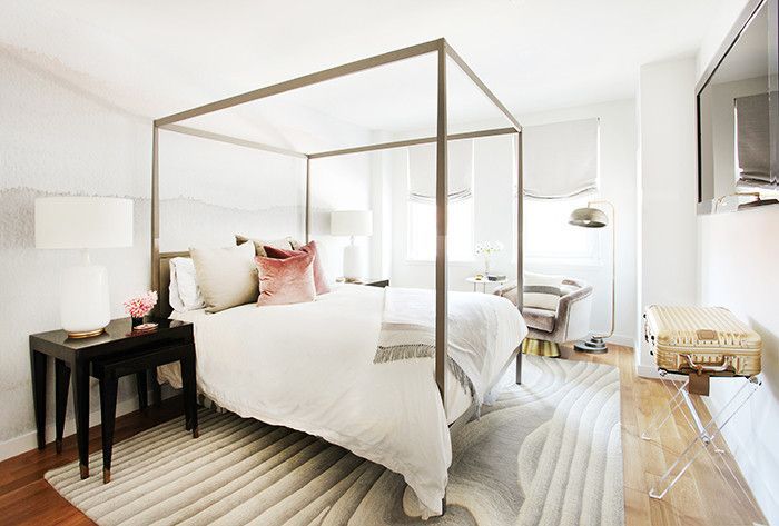 Colding开发的主卧室的颜色,并根据艺术黑色和白色的壁纸口音的装饰墙的故事。“对于主卧室中,Fornasetti的壁纸绝对称得上一个更前卫的方式,”她解释说,“因此,床上用品和配件有一个更醒目,图形质量。”对烛台和枕头铜饰面使其成为一个现代的,先进的卧室看起来完美的华丽装饰。