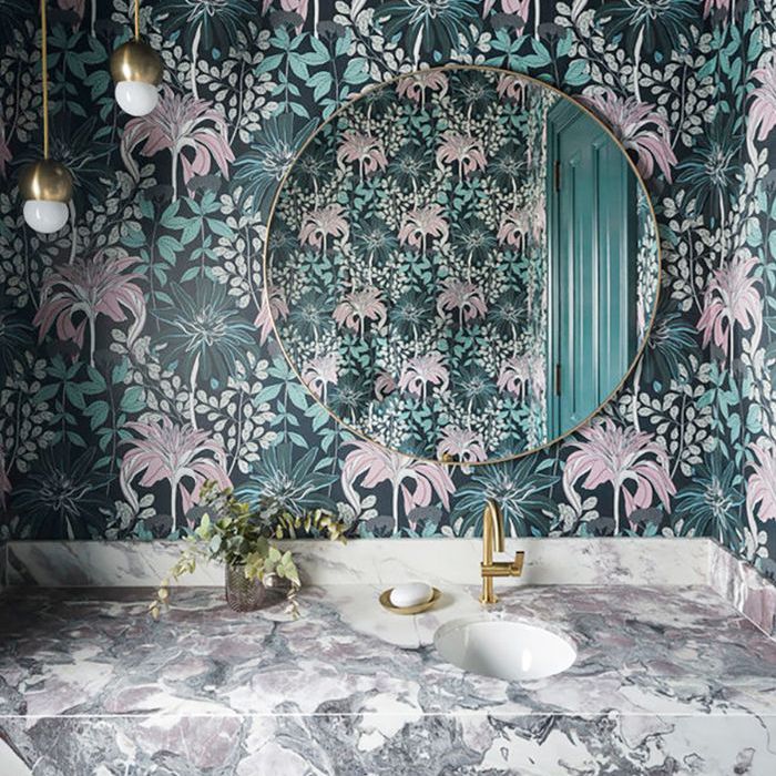 凭借深厚的灰色和静音棉花糖色调的螺旋,这种浴室柜是惊人的。我们爱壁纸的选择,体现了自然形态和颜色方案。