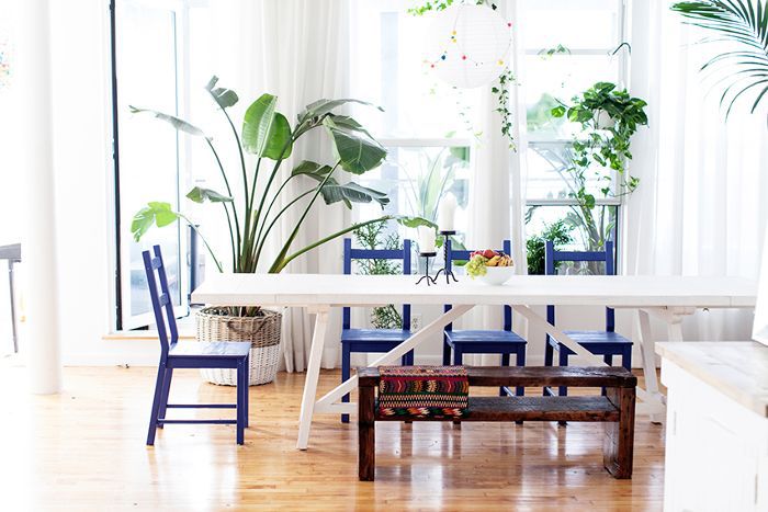 “多么华丽的是,餐桌上?”问DuBoise。“这么大的热情。我们花了大量的有迎头赶上的大日子后或托管的朋友和家人吃晚饭的时间。这些椅子是宜家的,我们只是把他们涂的是宝蓝色,颜色提醒我图卢姆的!”