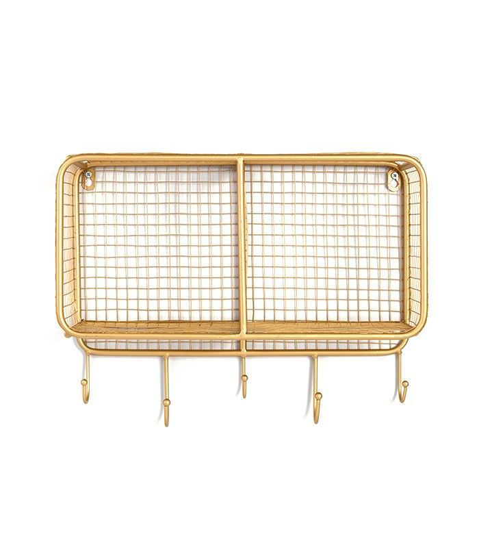 你回家后需要放钱包、帽子、钥匙和手提包的地方吗?这个储物墙的选择是超级迷人的,带有金丝的外观,还配有挂钥匙、皮带和狗绳的挂钩。它超级方便和酷。