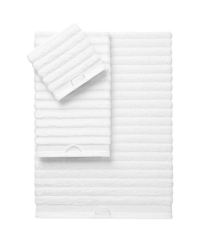 条纹不仅是时尚。这plushy纯棉毛巾一套是因为镶边装饰多了几分妩媚。